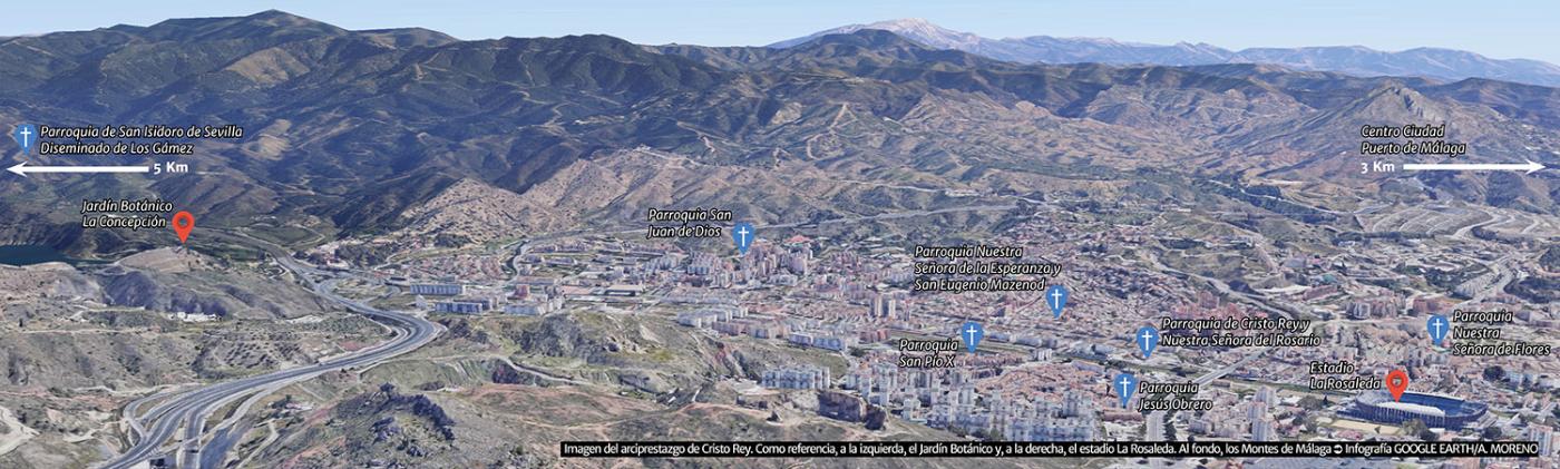 El arciprestazgo de Cristo Rey está formado por siete parroquias de la zona norte de la diócesis insertas en los barrios de Ciudad Jardín, Palma-Palmilla, las Flores y Los Gámez: San Pío X, San Juan de Dios, San Isidoro de Sevilla, Nuestra Señora de la Esperanza y San Eugenio Mazenod, Nuestra Señora de Flores, Jesús Obrero y Cristo Rey y Nuestra Señora del Rosario.