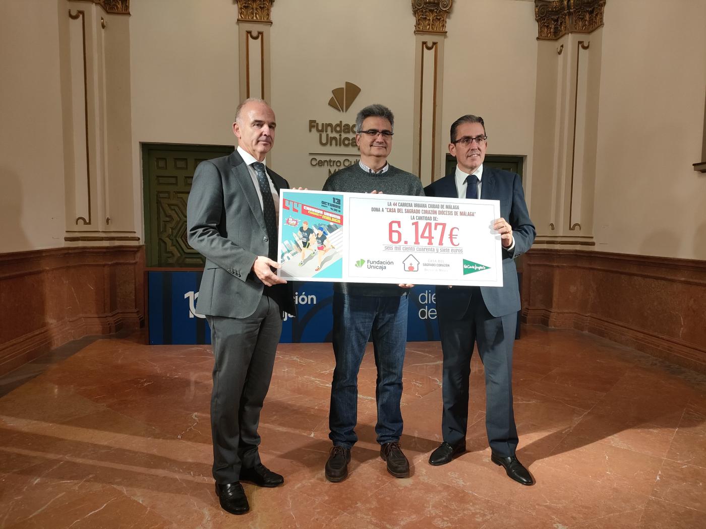 Las asociaciones beneficiarias de esta edición de la 44ª Carrera Urbana «Ciudad de Málaga», Casa del Sagrado Corazón, Fundación CienVidas, y Amappace, han recibido cada una un cheque por un importe de 6.147 euros en un acto celebrado en el Centro Cultural Fundación Unicaja de Málaga, destinado al mantenimiento y apoyo de su labor social.